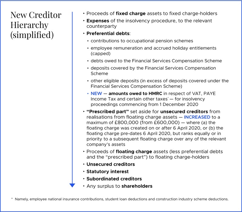 - In insolvency proceedings commencing from 1 December 2020, HMRC will rank ahead of both floating charge holders and unsecured creditors in an insolvency in respect of: