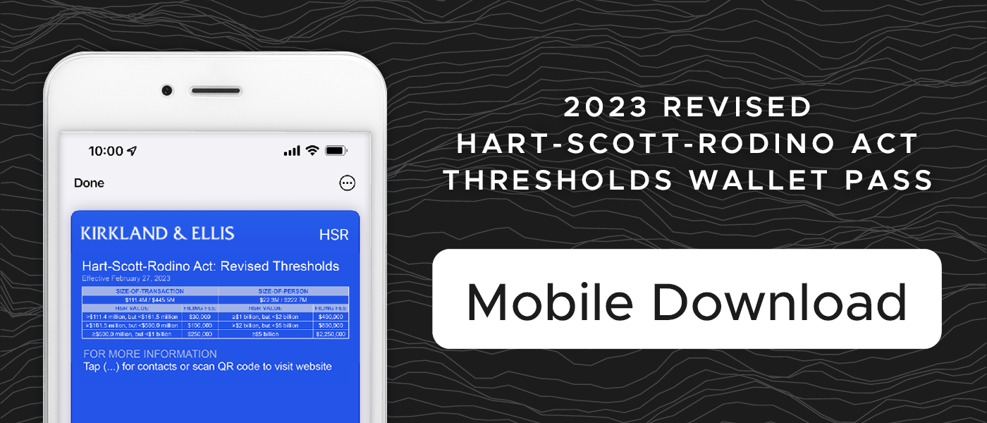 The HSR Act requires annual adjustment of the thresholds based on the change in the U.S. gross national product. The new HSR Act filing thresholds are effective for transactions closing on or after February 27, 2023 (the “effective date”). The new filing fees will impact any filings made on or after the effective date. Filings made prior to the effective date are not impacted by the changes to either set of thresholds. All thresholds will increase from the prior year.