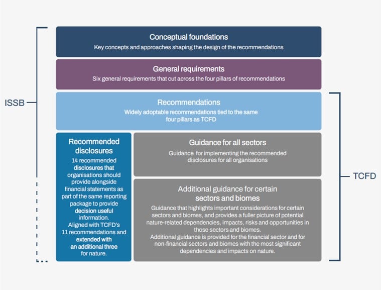 - Recommendations and guidance, which include conceptual foundations of nature-related disclosures, general requirements for the preparation of disclosures and a set of 14 recommended disclosures (aligned with TCFD-recommended disclosures, plus three additional unique recommendations) for all sectors to be provided alongside financial statements; and